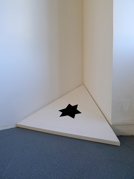 peinture à l’huile sur bois, triangle équilatéral de 100 cm de côté posé au sol dans un angle.