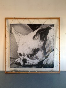 impression sur bâche micro-perforée, tendeurs, hêtre, 250 x 250 cm.