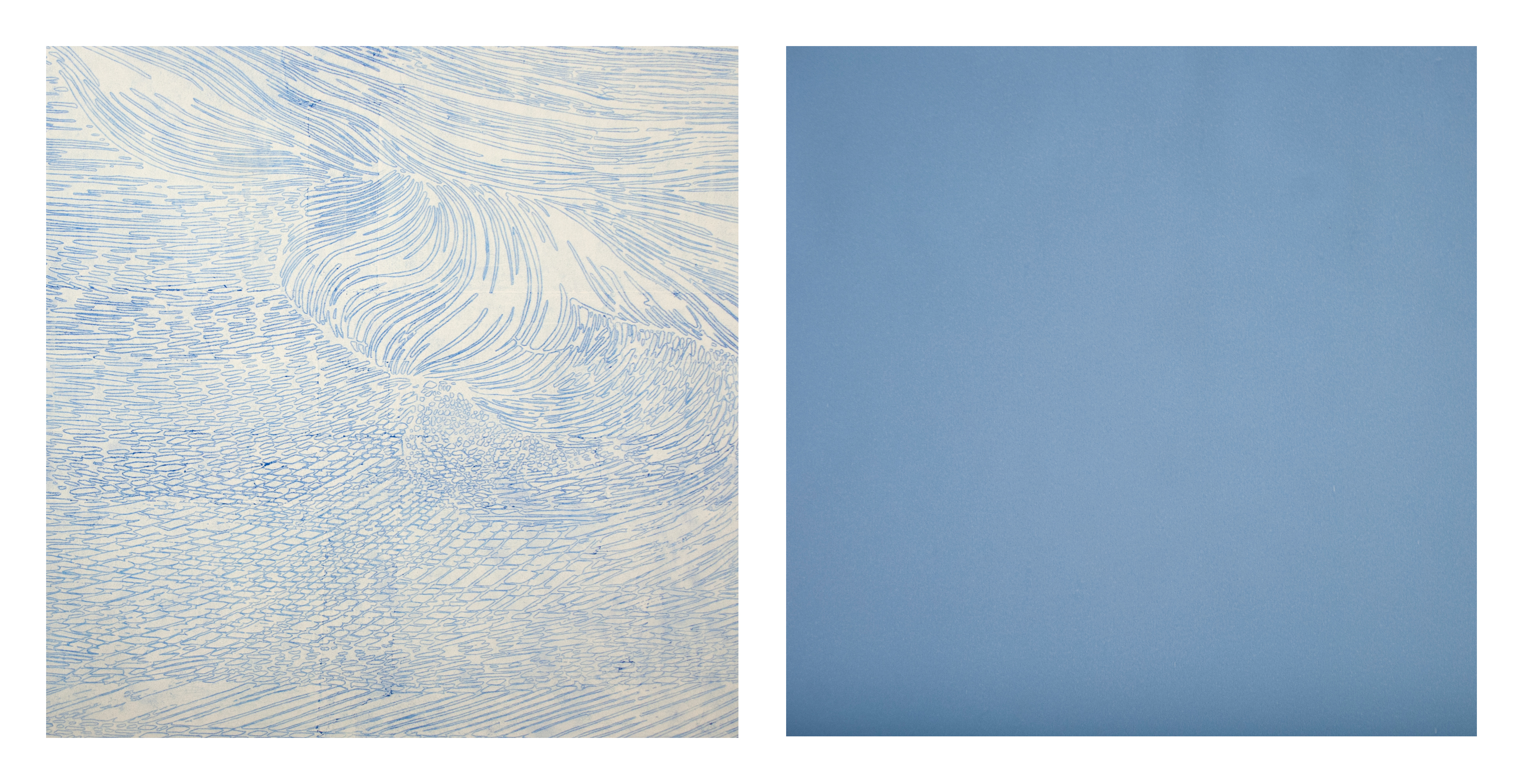 Immutable blue of noon, diptych, blue pigment on graffiti paper and back of this same paper, 50 x 50 cm chacun, 2014