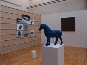 Installation comprenant de gauche à droite : « …alive, but Kiga was missing, still… » / « Un casque sans tête » / « Der blaue Pferd » / « Un siècle de peinture Allemande »